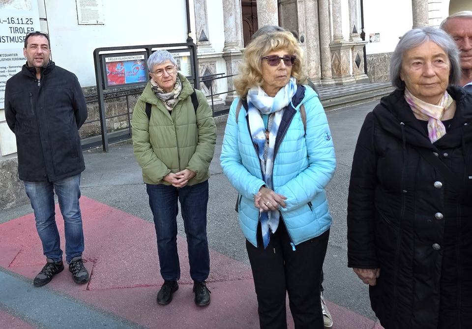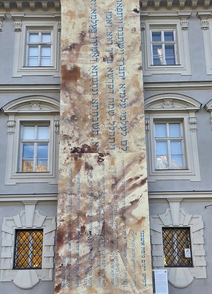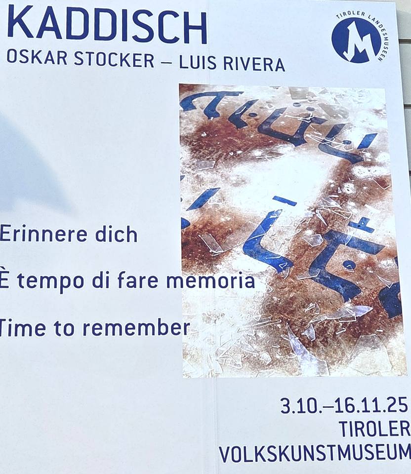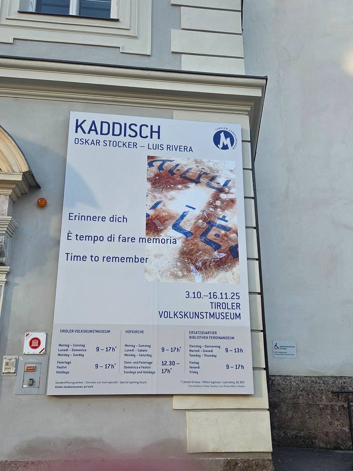 An der Fassade und im Kreuzgang des Tiroler Volkskunstmuseums wird eine bemalte Leinwand mit Auszügen aus dem jüdischen Gebet Kaddisch gezeigt, einem Text, der zum Gedenken an Verstorbene gesprochen wird, gestaltet von den österreichischen Künstlern Oskar Stocker und Luis Rivera.