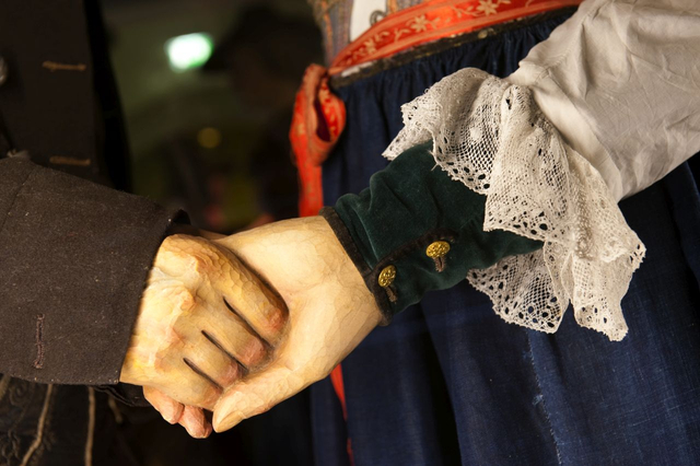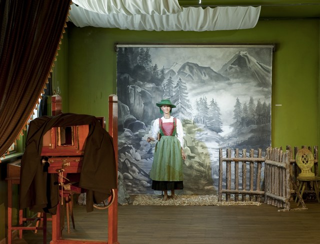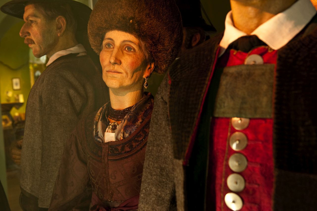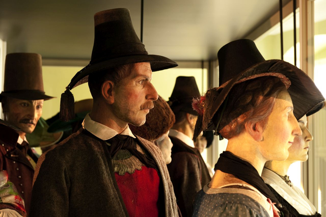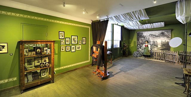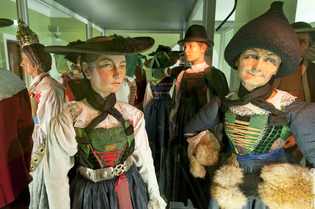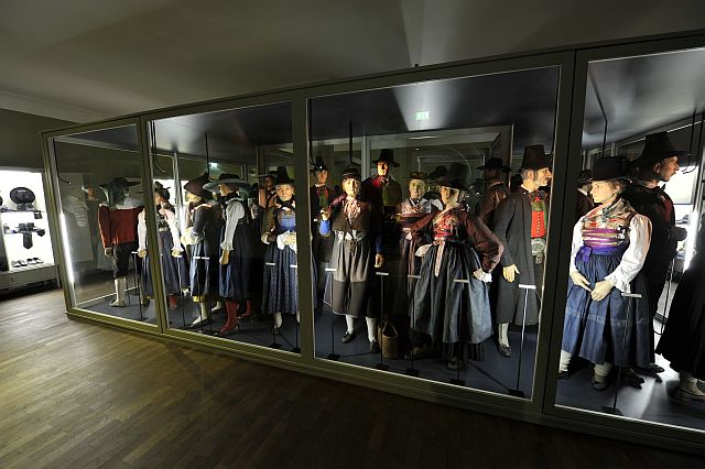 Mit Tracht bezeichnete man über Jahrhunderte hinweg die Bekleidung im Allgemeinen. War zuvor die Zugehörigkeit zu einem Berufs- oder einem sozialen Stand an ihr abzulesen, sollte die Tracht im 19. Jahrhundert insbesondere Regionen voneinander unterscheiden. Im letzten Viertel des 19. Jahrhunderts wurden die farbenfrohen Festtagskleider, wie sie an 48 überlebensgroßen Holzfigurinen zu sehen sind, beim Bildungsbürgertum populär. Die Figurinen schnitzte der Osttiroler Virgil Rainer anlässlich der Eröffnung des Museums 1929 für den sogenannten "Trachtensaal". Das Fotostudio am Eingang des Themenbereiches "Schein und Sein" wurde nach historischen Vorbildern rekonstruiert und bringt den romantischen Blick auf die ländliche Bevölkerung sowie die Idealisierung einer um 1900 bereits abgelegten Kleidung zum Ausdruck.