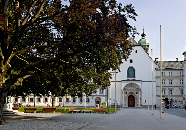 Die Hofkirche mit dem Hochgrab Kaiser Maximilians I. (1459-1519) wurde in den Jahren 1553 bis 1563 erbaut. Bis alle Arbeiten abgeschlossen waren, dauerte es allerdings zwei Jahrhunderte. Erst in den 1730ern wurde der letzte Stuck angebracht. Daher lassen sich unterschiedliche Stile von Gotik, Renaissance und Barock erkennen.